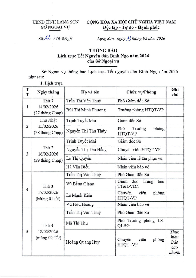 | Tiêu đề văn bản | Lịch trực Tết Nguyên đán Bính Ngọ năm 2026 của Sở Ngoại vụ | ||