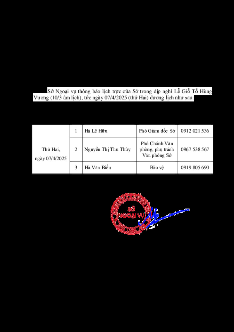 | Tiêu đề văn bản | Thông báo Lịch trực cơ quan trong dịp nghỉ Lễ Giỗ tổ Hùng Vương (10/3 âm lịch) năm 2025 | ||