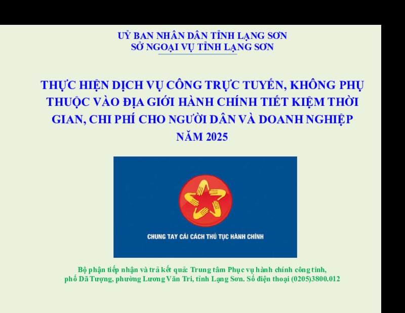 THỰC HIỆN DỊCH VỤ CÔNG TRỰC TUYẾN, KHÔNG PHỤ THUỘC VÀO ĐỊA GIỚI HÀNH CHÍNH TIẾT KIỆM THỜI GIAN, CHI PHÍ CHO NGƯỜI DÂN VÀ DOANH NGHIỆP NĂM 2025 08/12/2025, 19:02:06 - Lượt xem: 0 Tweet Thêm vào danh sách Báo xấu Thông tin tài liệu THỰC HIỆN DỊCH VỤ CÔNG TRỰC TUYẾN, KHÔNG PHỤ THUỘC VÀO ĐỊA GIỚI HÀNH CHÍNH TIẾT KIỆM THỜI GIAN, CHI PHÍ CHO NGƯỜI DÂN VÀ DOANH NGHIỆP NĂM 2025