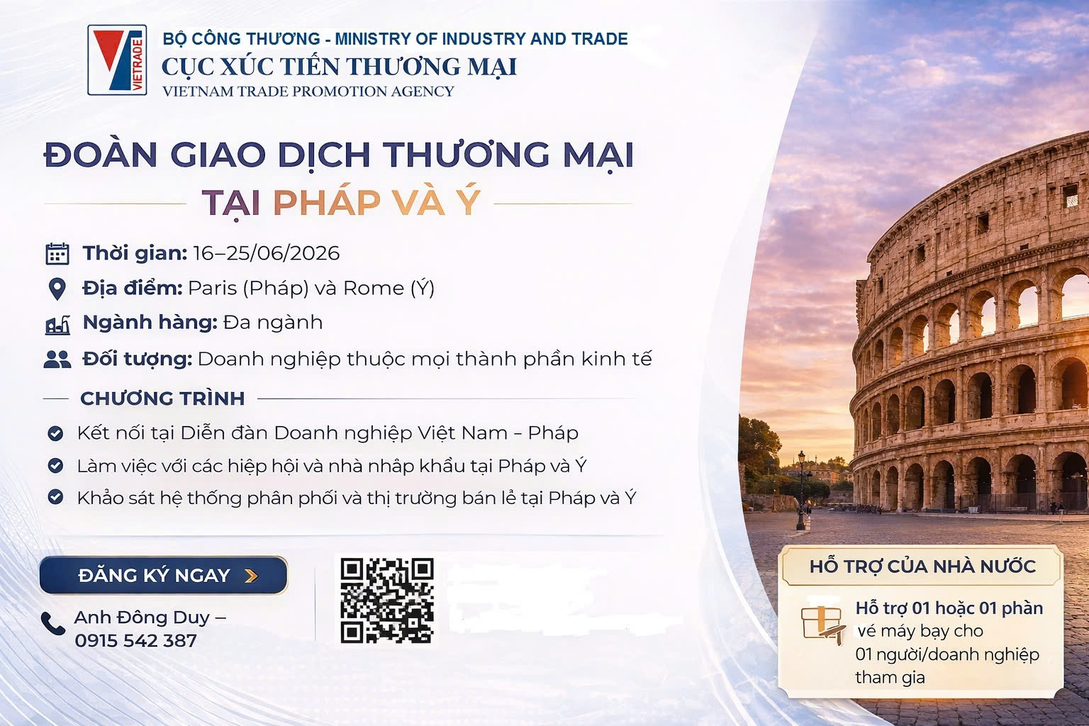 Thực hiện Chương trình cấp quốc gia về xúc tiến thương mại (XTTM) năm 2026 được Bộ trưởng Bộ Công Thương phê duyệt tại Quyết định số 3838/QĐ-BCT ngày 31 tháng 12 năm 2025, Cục XTTM phối hợp với các đơn vị liên quan tổ chức "Đoàn giao dịch thương mại tại Pháp và Ý", chi tiết như sau: