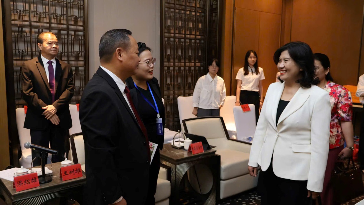 Bà Trịnh Tuyết Mai, Giám đốc Sở Ngoại vụ tỉnh trao đổi bên lề cùng Lãnh đạo Chính quyền thành phố Vân Phù, tỉnh Quảng Đông, Trung Quốc tại Hội kiến. Ảnh: Vũ Giang