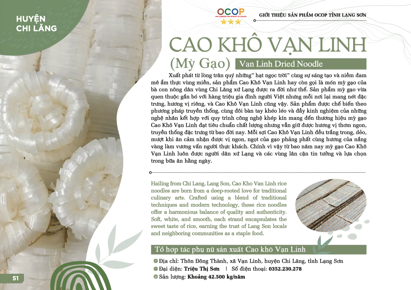 Cao khô Vạn Linh là mì gạo, được làm từ những hạt gạo do chính người dân bản địa tự tay gieo trồng và chăm bón. Những hạt gạo Đoàn Kết hay hạt gạo Bao Thai căng tròn trắng ngần chứa đựng biết bao mồ hôi tâm huyết của người nông dân. Để sản xuất được những tệp cao khô dai dẻo, người thợ Vạn Linh phải trải qua một quy trình chế biến công phu, đòi hỏi sự tỉ mỉ trong từng công đoạn. Từ việc tráng bánh sao cho độ dày vừa phải, đến việc đong đếm thời gian phơi bánh trên những giàn tre để cho ra những sợi Cao khô trắng, dai, thơm, đậm vị ngọt.