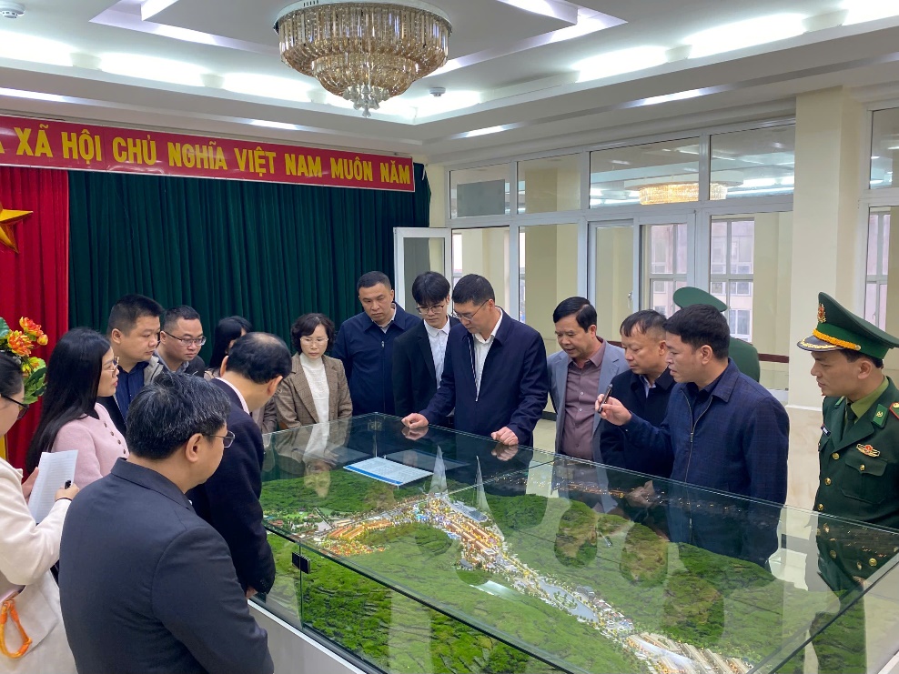 Đoàn đại biểu thị Bằng Tường, Quảng Tây, Trung Quốc khảo sát quan mô hình thiết kế Khu hợp tác thương mại, du lịch Tân Thanh (Việt Nam) – Pò Chài (Trung Quốc). Ảnh: Mai Thu