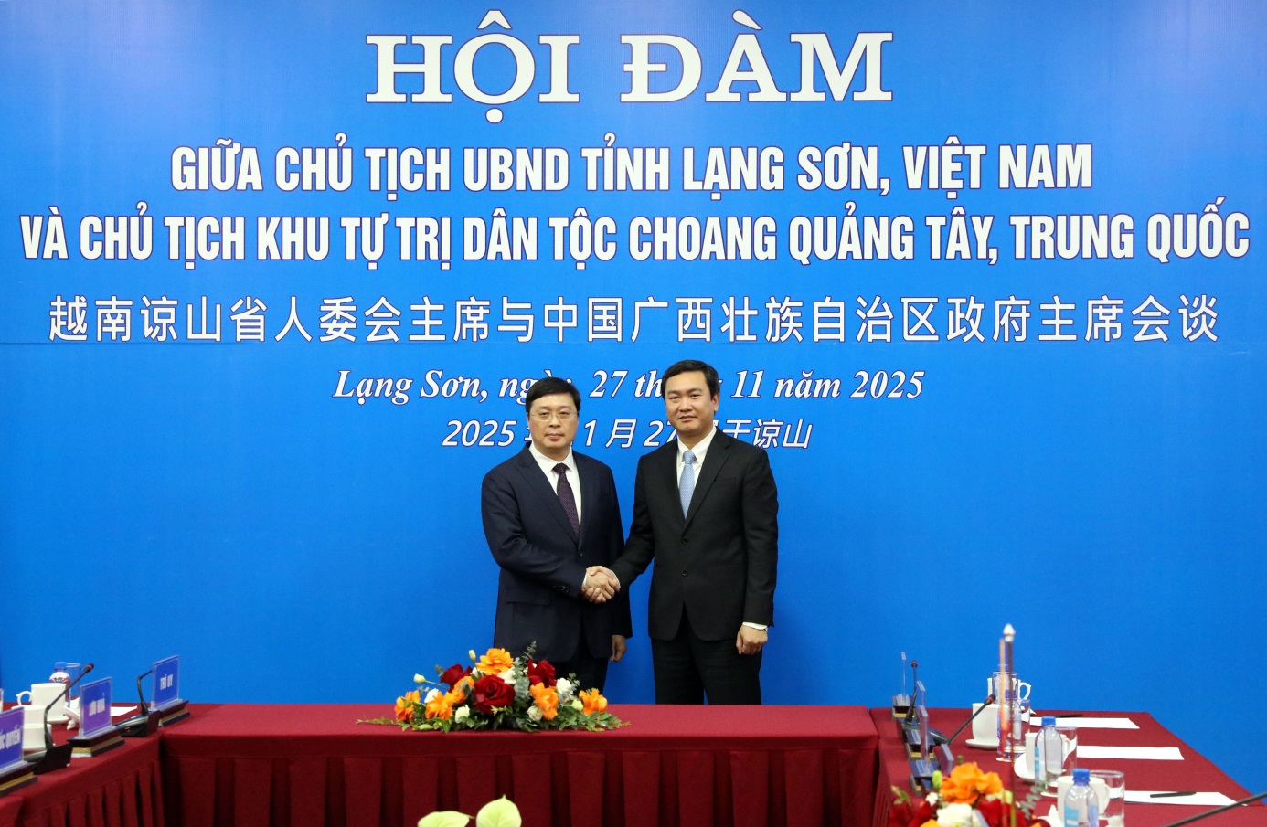 Đồng chí Nguyễn Cảnh Toàn, Chủ tịch UBND tỉnh Lạng Sơn cùng đồng chí Vi Thao, Chủ tịch Chính quyền Khu tự trị dân tộc Choang Quảng Tây tại Hội đàm.