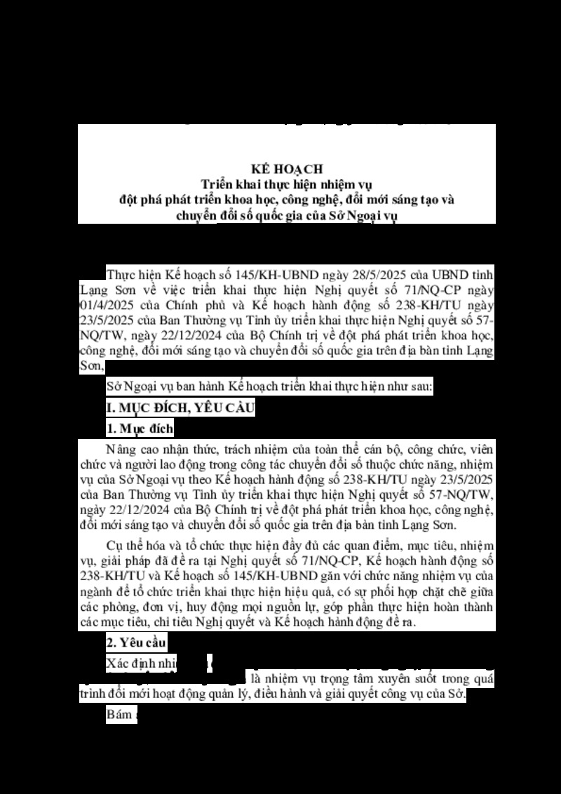 | Tiêu đề văn bản | Kế hoạch triển khai thực hiện Nghị quyết số 71/NQ-CP ngày 01/4/2025 của Chính phủ và Kế hoạch hành động số 238-KH/TU ngày 23/5/2025 của Ban Thường vụ Tỉnh ủy triển khai thực hiện Nghị quyết số 57-NQ/TW, ngày 22/12/2024 của Bộ Chính trị về đột phá phát triển khoa học, công nghệ, đổi mới sáng tạo và chuyển đổi số quốc gia | ||